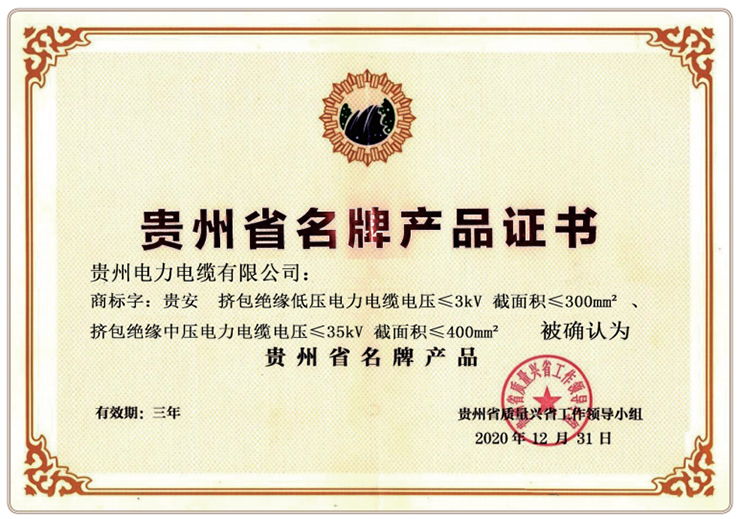 貴州省名牌產品證書